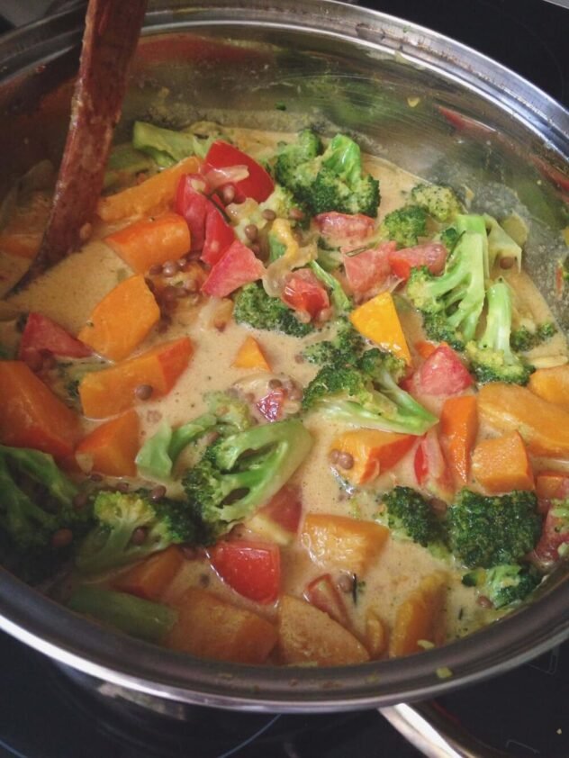 Na pánev přichystejte olej s chilli, kari, kurkumou a mletým koriandrem a nechte tuto směs napěnit na silnějším ohni. Posléze přidejte nakrájenou cibulku a smažte do změknutí. Následně přidejte česnek a mírně s cibulkou opražte. Osolte, přidejte na kousky nakrájenou dýni s trochou vody a duste, dokud nepůjde dýně propíchnout vidličkou s minimální vynaloženou námahou. Následně přidejte na kousky nakrájenou brokolici a kokosové mléko a duste na mírnějším ohni, dokud brokolice trochu nezměkne. Na posledních 10-15 minut přidejte nakrájené rajče a nechte chutě, ať se krásně spojí. Podávejte s preferovanou přílohou (já jsem použila jasmínovou rýži) či samotné (dýně je sama o sobě relativně sytá).
