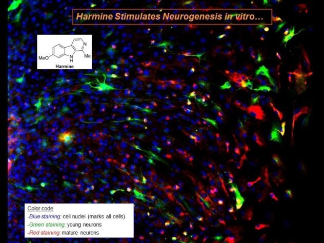 Při zkoumání působení harminu a tetrahydroharminu na nervové kmenové buňky bylo dále zjištěno, že velmi silně stimulují genezi nových nervových buněk. Jelikož bylo pozorováno snížení výskytu deprese u chronicky nemocných pacientů i 21 dnů po užití ayahuasky, nabízí se spekulace, zda neurogeneze způsobená látkami obsaženými v ayahuasce nemá roli v dlouhotrvajících účincích tohoto léčivého prostředku. Tento mechanismus by mohl být dále platný také při využití ayahuasky pro léčení závislostí, traumatických šoků, osobnostních poruch apod.