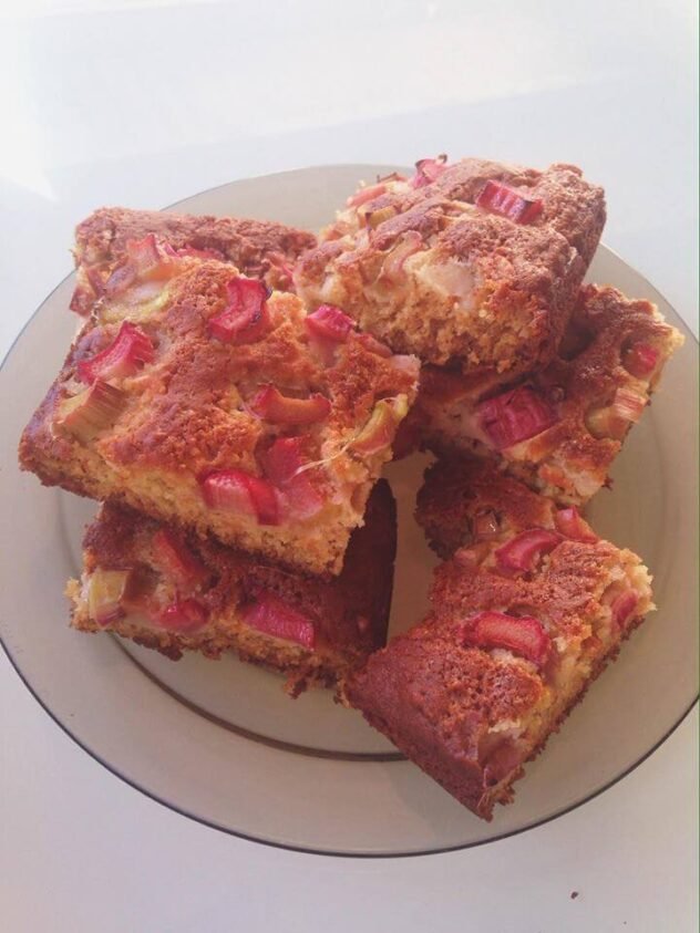 Rebarboru nakrájejte na plátky a promíchejte s cukrem. Nechte stát, než připravíte těsto: smíchejte zvlášť sypké a zvlášť tekuté suroviny, následně smíchejte obě směsi dohromady a vmíchejte mrkev. Vymažte pekáč margarínem či olejem. Posléze nalejte dobře promíchané těsto na pekáč, jemně posypte krystalem a navrch rozházejte rebarboru. Pečte na 180 °C, dokud zapíchnuté párátko nevytáhnete suché (zhruba 25-30 minut).