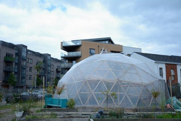 Za nápadem postavit pěstitelský dóm stojí pánové Jamie Roche, Niall O’Brien, Eoin O’Neil a Ivan Rynn (celé povídání jsem absolvoval pouze s Niallem). Tito čtyři se dozvěděli o vznikající zahradě a oslovili výše zmíněné občanské sdružení, zda by měli o něco takového zájem. Přesněji řečeno Jamie je Dougalův soused a jednoho dne se u pinty Guinesse Jamie zeptal, jestli tam můžou postavit pěstitelský dóm. Jednotlivé díly – trojúhelníkové rámy – byly předem vyrobeny v truhlářské dílně. Ty se pak jeden po druhém smontovali na místě. Samotná hrubá stavba byla hotova během jednoho víkendu. Jako základy použili staré palety, které byly rozmístěny přes vyhloubený výkop, do nějž se předtím umístili plastové tanky na vodu o celkovém objemu 4.800 litrů. Dóm je designován pro zadržení srážkové vody, která je zachycena na jeho povrchu, svedena do okapu, jenž bude umístěn při zemi kolem něj a jímána do podzemních tanků. Odtud lze vodu ručně přečerpávat nahoru do pěstebních van, přípravných nádob a do nainstalovaného kohoutku pro běžné použití. A věřte, že jak v Irsku dokáže zapršet, tak o vodu nouze rozhodně nebude.