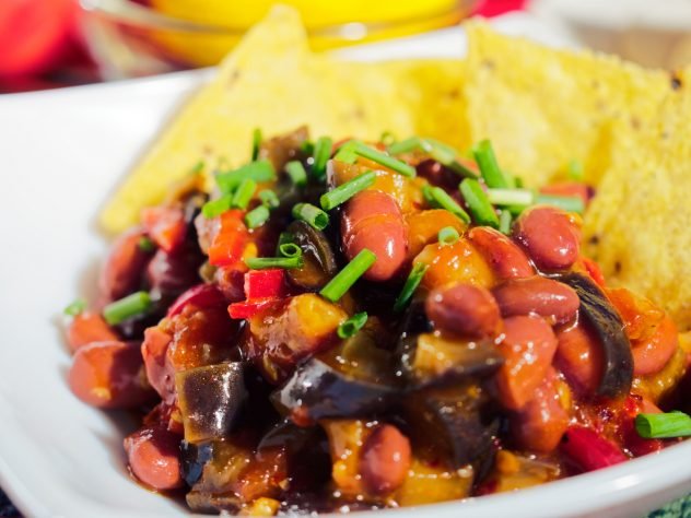 Recept na veliký hrnec (10 porcí / 7 litrů?) chili sin carne z velkých bílých fazolí, kukuřice a rajčat: