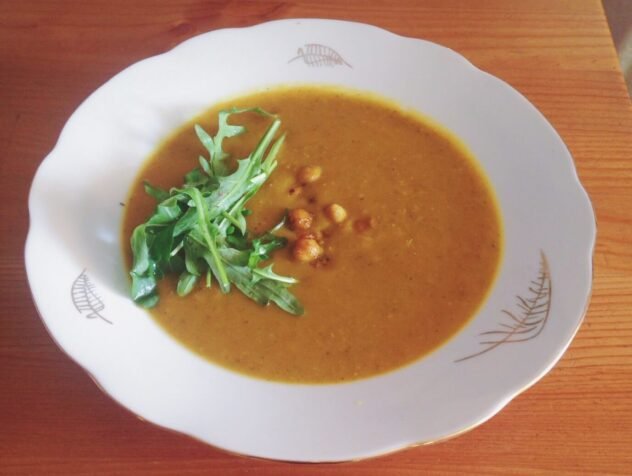 Asi po hodině vaření je polévka zralá k mixování. Odstavte tedy z plamene a s výhodou použijte tyčový mixér (či jakýkoli jiný) k dosažení kýžené krémovité konzistence. Poté opět postavte na mírný plamen a přidejte kokosové mléko. Takto nechte polévku ještě zhruba deset minut mírně probublat, kvůli lepšímu propojení chutí a posléze s chutí podávejte. Polévku podávejte s opékanou cizrnou a volitelně můžete na talíři dozdobit pár listy rukoly ochucenými pepřem.