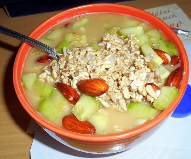 Jednoduché, levné, tepelně nezpracované a neskutečně výživné jídlo, které pohladí vaše vnitřnosti. Základem je kaši neuvařit, nýbrž namočit vločky přes noc nebo na 24 hodin. Druhý den budou vločky měkké, jako by byly uvařené, a ořechy šťavnaté a křupavé, jako by právě zralé spadly ze stromu.