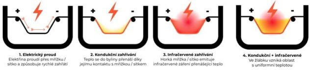 přes kovové sítko přenášející teplo na vaše bylinky shromážděné nahoře. Současně horké sítko vysílá infračervené paprsky, které přenášejí přes bylinu další teplo.